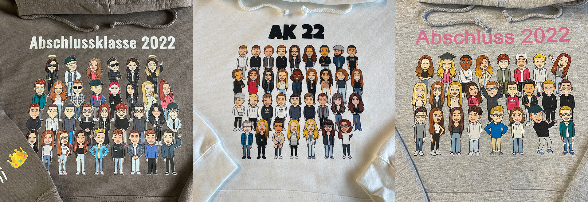 Sofern Ihr eine bestimmte Anordnung / Reihenfolge der Bitmojis wünscht, brauchen wir hierzu eine Information. Am einfachsten ist es, wenn Ihr die Bitmoji Datein Namen durchnummeriert in der Reihenfolge, wie wir diese auf dem Motiv anordnen sollen. Solltet Ihr Jungs in einer Reihe / Seite, Mädchen auf der anderen Reihe / Seite haben wollen, reicht eine kurze Info. Sollte die Reihenfolge egal sein und wir keine Info von euch bekommen, wählen wir die Reihenfolge zufällig aus.
