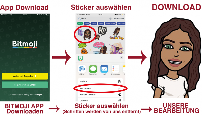 Ihr habt hierbei einen ganz einfachen Weg, eure Bitmoji zu erstellen und zu downloaden, um diese uns zur Verfügung zu stellen: