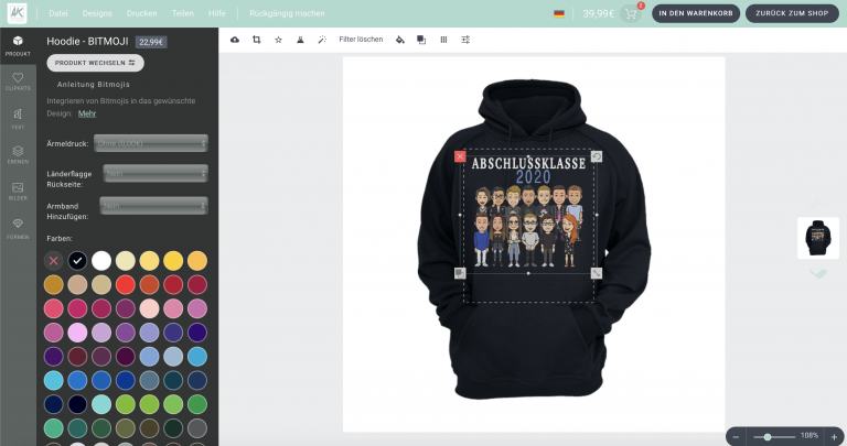 Wenn Ihr die Textilfarbe, die Stückzahlen der Größen und die Extras ausgewählt habt, könnt Ihr das erstellte Produkt in den Warenkorb legen. Ihr möchtet die Rückseite von uns ebenfalls erstellen lassen? Kein Problem! Sobald Ihr weiter zur Kasse geht, besteht die Möglichkeit, dass Ihr uns die Namen für die Rückseite, Extrawünsche wie z.B. Überschrift, Klassen/Schulname oder sonstiges mitteilt, welche für die Motiv Erstellung von euch gewünscht und von uns zu beachten sind.